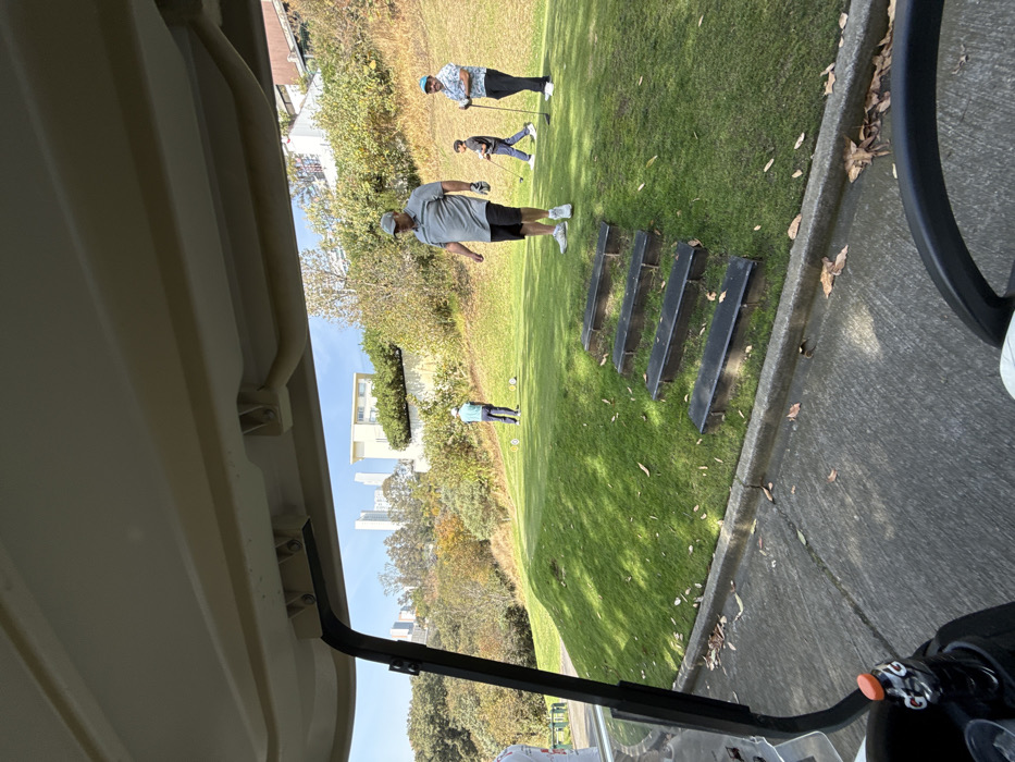 A golf course view from inside a golf cart. Several golfers are scattered across the green. A man in a gray shirt and dark shorts is closest, standing on the grass. Behind him are a man in a patterned shirt and two more golfers in the distance. A set of dark, rectangular stairs is set into the green. Trees and buildings are visible in the background. The cart's roof, a support bar, steering wheel, and the edge of a concrete path are in the foreground.