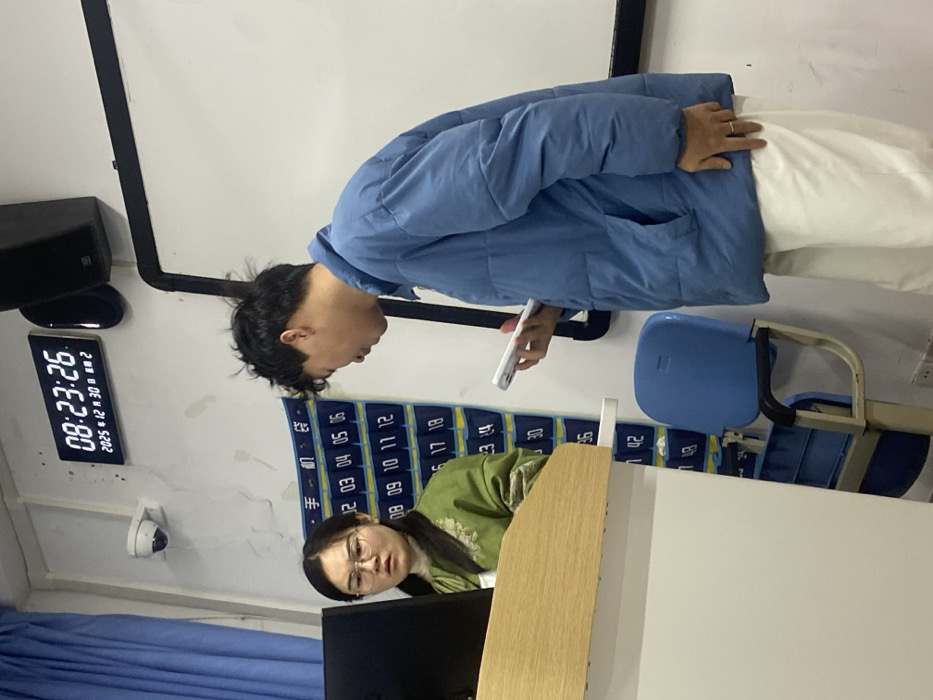 Two people are in a classroom. The person in the foreground has on a green top and is sitting at a desk. There is a computer on the desk. A person in a blue jacket stands nearby, holding a white cell phone. A blue chair is also visible. A calendar hangs on the wall with the numbers 02, 03, 04, 05, 06, 08, 09, 10, 11, 12, 16, 17, 18, 30, and 36. A digital clock shows 8:23:26, and a date of 2025/12/30. A security camera is on the wall.