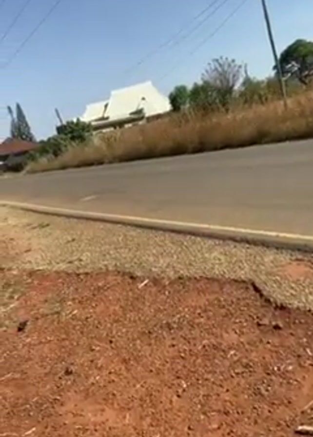 A person stands beside a road, filming as a green and yellow auto rickshaw, also known as a tuk-tuk, drives past on the road. The ground beside the road is dirt with scattered pebbles. In the background, there is a house with a white roof, trees, and power lines. The sky is clear and blue.