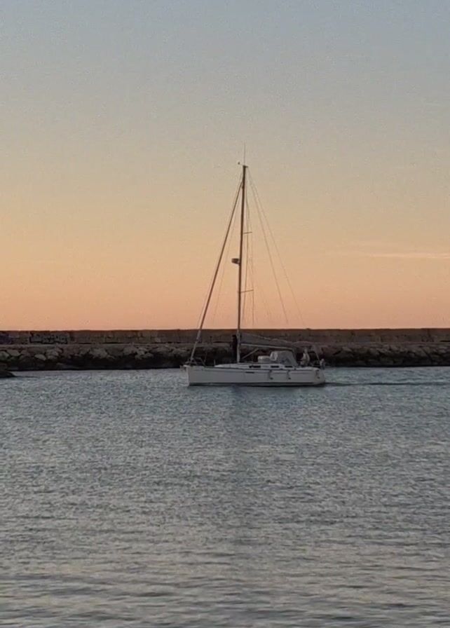 A sailboat is docked along a rocky shore. The sky is a gradient of light blue to orange. The water is calm with slight ripples.