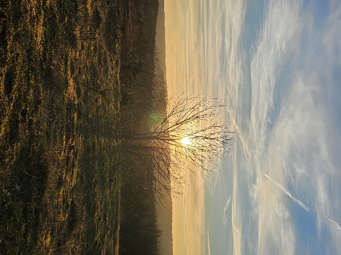 The image displays an outdoor landscape scene located in Schifflange, Luxembourg. The scene is illuminated by a low-angle sun, positioned centrally behind a leafless deciduous tree, creating a silhouette effect. The sun emits intense golden light with a visible lens flare. The sky transitions from a golden-orange hue at the horizon to a light blue in the upper section, featuring wispy white clouds and a prominent white contrail traversing the upper right quadrant. The foreground consists of an uneven, grassy field with sparse green and brown vegetation, partially illuminated by the direct sunlight and showing areas of shadow. The mid-ground and background present a dark, undulating horizon line with a dense line of trees and distant landforms, suggesting a view over a developed area. No individuals or specific actions are depicted.