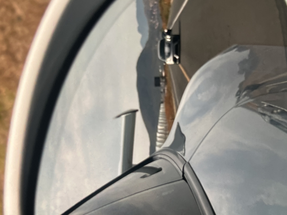 An aerial view captured through an aircraft window. The plane's wing and reflective surface dominate the foreground. Outside, the landscape includes an expanse of dry, tan terrain leading up to a light-colored mountain range. A road with what appears to be cars on it is also visible, reflected in the plane's polished surface. The natural light and reflections contribute to the image's dynamic feel.
