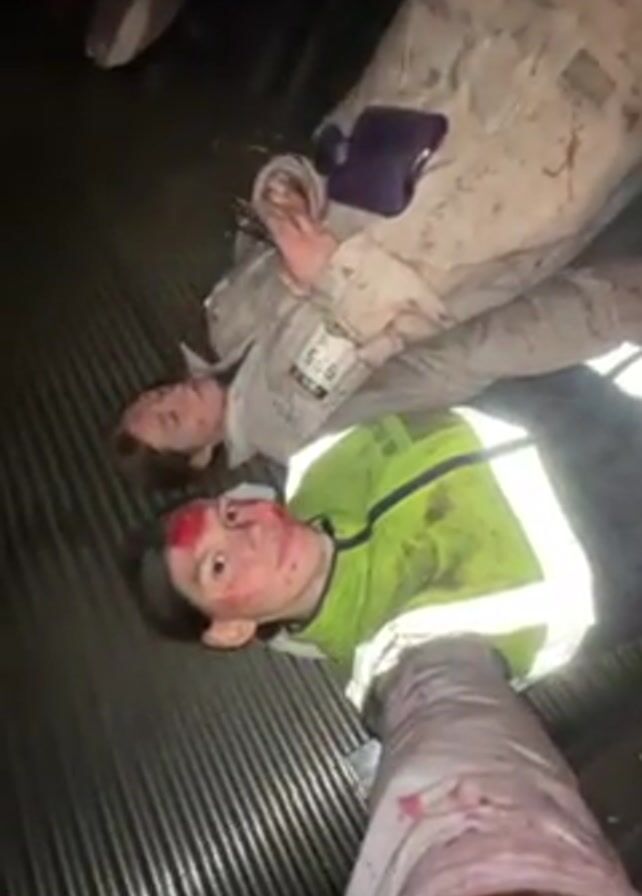 three people lying on a corrugated surface. The two individuals most visible appear to have blood on their faces. One is wearing a high-visibility jacket over a neon green shirt, and the other wears a white jumpsuit with the number 585 on it. The third person, partially visible, also seems to have blood on their leg. The environment appears dark and possibly industrial.