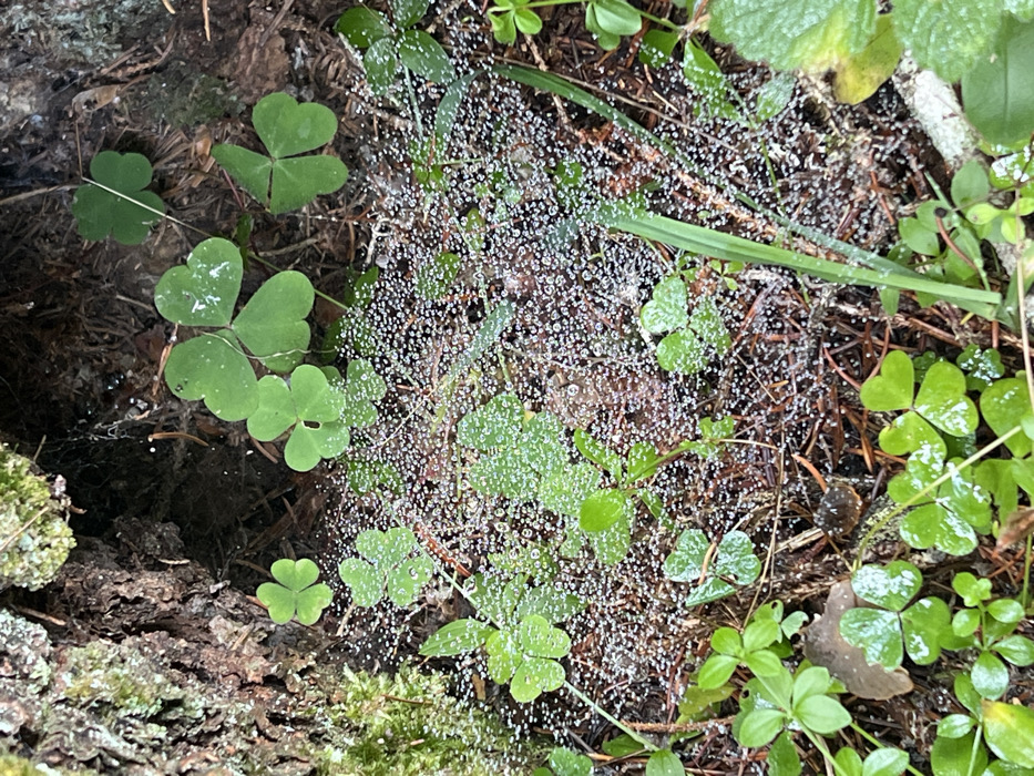 - "A close-up, high-angle view depicts a spider web densely covered with spherical water droplets, likely dew, stretching across the forest floor in Pitomine, Montenegro" by FM-CjoWV2, licensed under CC BY 4.0