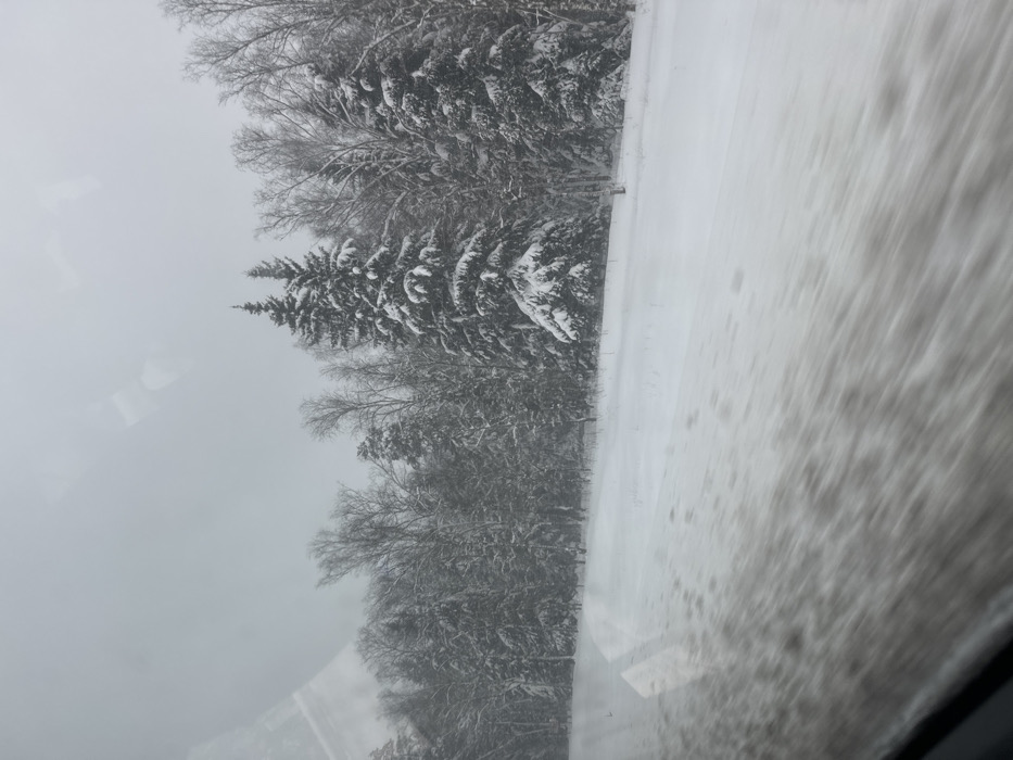 The image presents a snow-covered winter landscape, likely situated in Unknown, Russia. The scene is viewed from a moving perspective, evidenced by the motion blur in the immediate foreground, which shows a strip of discolored snow or slush. Beyond this, a flat expanse of undisturbed white snow extends to a dense treeline. The treeline comprises a mix of coniferous trees, notably two tall, heavily snow-laden fir or spruce trees, and deciduous trees with bare, snow-dusted branches. All trees are uniformly blanketed in fresh snow. The sky is overcast and light grey, suggesting a heavy snowfall or a deeply clouded winter day. No individuals, animals, or man-made structures are visible.