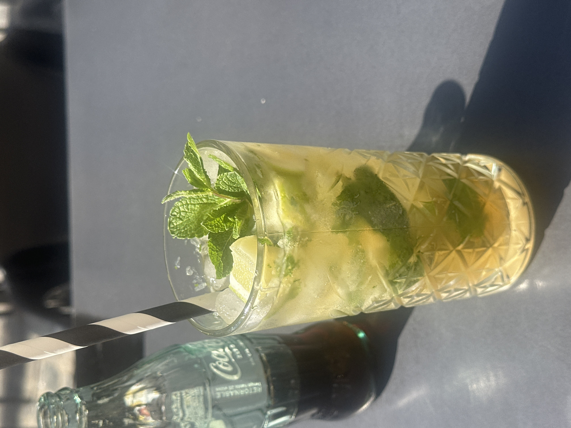 A tall, textured glass containing a light yellow-green beverage with ice cubes, lime wedges, and fresh mint leaves is positioned on a dark gray table. A black and white striped paper straw extends into the drink. To the left, a light green-tinted glass bottle of Coca-Cola Zero, labeled "RETRONABLE," is partially visible, containing a dark brown liquid. Direct sunlight illuminates the scene, casting prominent shadows of the glass and bottle to the right on the table. The background is out of focus and dark, suggesting an outdoor setting. This scene is located in Alicante, Spain.