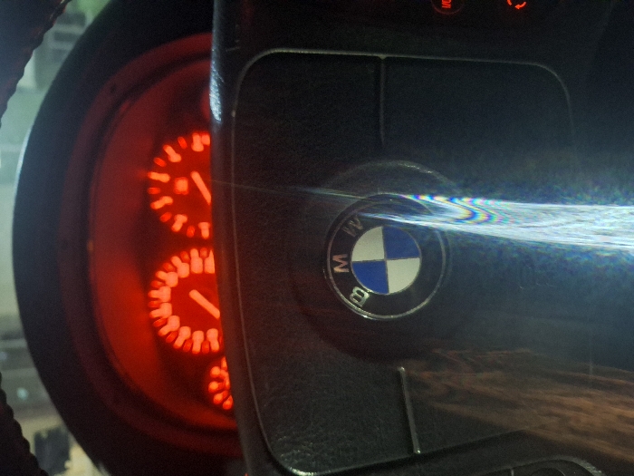 The image depicts the interior of a BMW vehicle, observed from the driver's perspective. A black, leather-wrapped steering wheel with the BMW emblem centered in its airbag cover occupies the lower and middle foreground. The emblem displays the blue and white checkered pattern and the letters "BMW". To the immediate right of the emblem, a portion of the right steering wheel spoke is visible, featuring partially identifiable controls including "VOL" (volume) and an arrow symbol, both illuminated in red. Above the steering wheel, the instrument cluster is visible, illuminated with a distinct red backlight. At least three primary circular gauges are discernible, though specific numerical readings on the speedometer and tachometer are indistinct due to photographic resolution and angle. The needles of these gauges are present. The overall scene is dimly lit, emphasizing the red illumination of the vehicle's dashboard. A prominent vertical light artifact, appearing as a multi-colored streak with a strong blue and white component, passes vertically through the image, intersecting the BMW emblem and extending downwards, suggesting a strong light source or lens flare. No individuals are visible. No explicit actions or interactions are depicted. The environment outside the vehicle is not discernible, precluding any determination of its specific location within Burgas, Bulgaria.