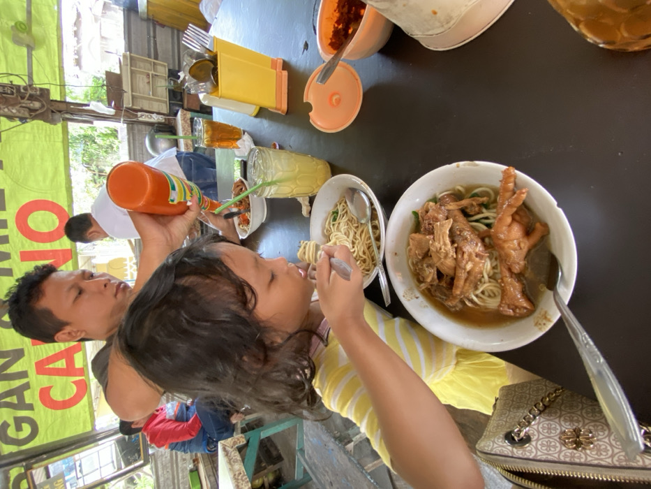 An indoor-outdoor eatery in Balonggabus, Indonesia, shows a young girl and an adult male seated at a black table, eating