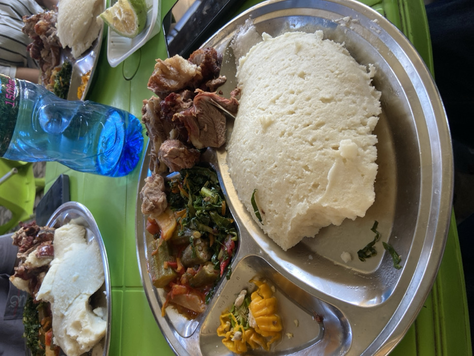 A stainless steel plate with four sections contains a meal. In the top section, a large portion of white, soft-looking ugali (cornmeal porridge), is placed next to a section with a stew of green leafy vegetables, okra, tomatoes, and onions, and a separate section with a smaller portion of ugali and a side of yellow corn kernels. The last section contains a large portion of meat, likely goat or beef, that is brown and looks like it was braised. The plate is on a bright green surface, and a blue plastic water bottle is on the right side of the plate. The location of the photograph is in Dodoma, Tanzania at coordinates -6.161, 35.764.