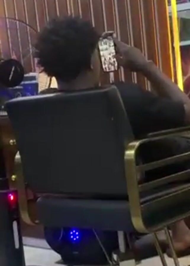 man with dark curly hair sitting in a black and gold salon chair, looking at his phone. He is wearing a black shirt. The salon has wood-paneled walls, and there are other people and salon chairs visible. A fan and a small, round object that emits blue light are also visible. Hair clippings are on the floor around the chair. The person appears to be scrolling through photos or videos on their phone.