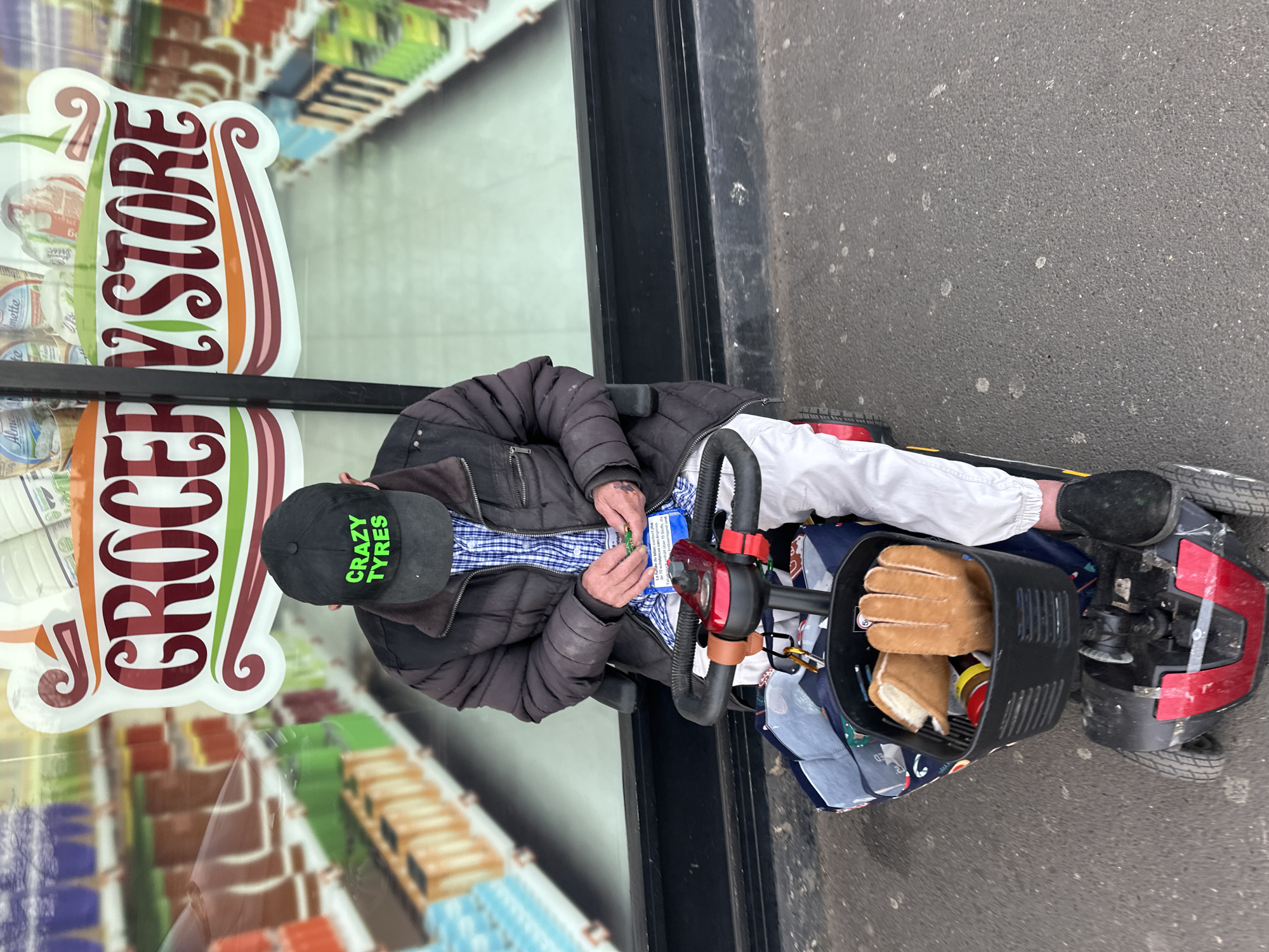 - "An individual is seated on a red and black mobility scooter directly outside a "GROCERY STORE" in Tunbridge Wells, United Kingdom" by FM-13LyK2, licensed under CC BY 4.0