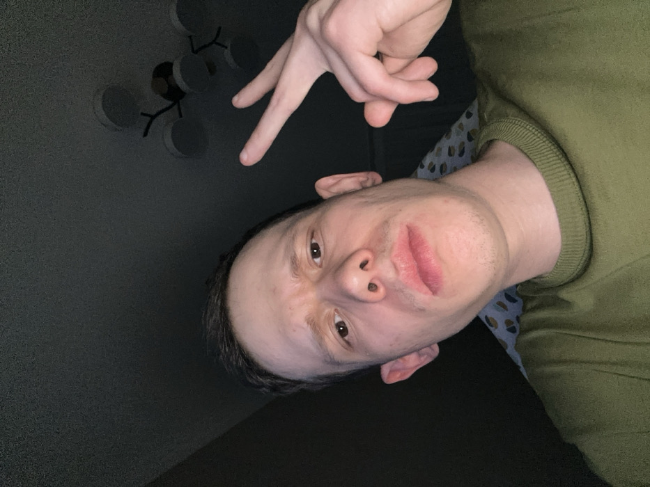- "A close-up, low-angle selfie captures a person with fair skin, light brown hair, and an olive green sweater" by FM-OhWro1, licensed under CC BY 4.0