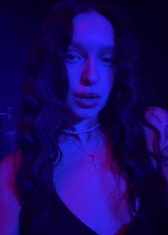 A woman with wavy dark hair is filmed in a dark environment lit with blue light. She wears a black top and a pearl necklace with a cross pendant. She looks directly at the camera with a slight tilt of her head. There is music playing in the background.