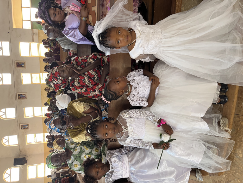 In Kuru Karama, Nigeria, an indoor scene displays four young Black girls in white dresses seated on a wooden pew in the foreground, facing the camera