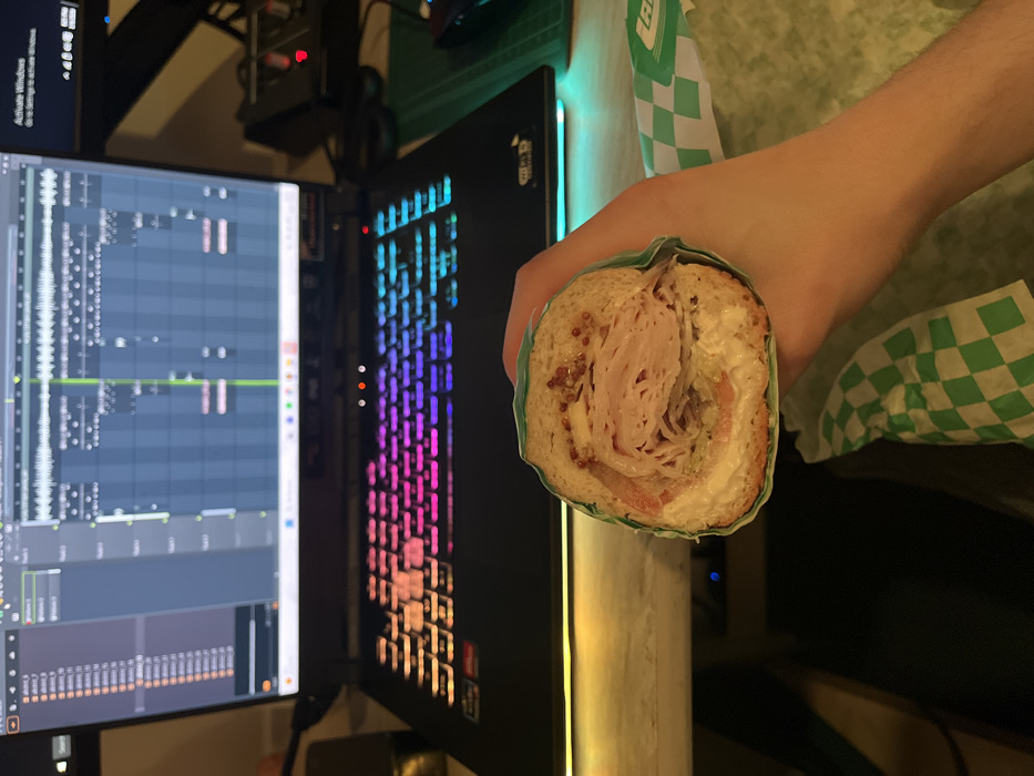 The image depicts an indoor scene, likely a personal workspace or home office, in Toronto, Canada. In the foreground, a light-skinned hand holds a partially wrapped sandwich. The sandwich is a sub-style roll, appearing to be multigrain, filled with sliced deli meat (consistent with turkey), lettuce, sliced tomato, a creamy white spread, and whole grain mustard. The sandwich is wrapped in green and white checkered paper, bearing a partially visible logo consistent with "Hero" branding, a Canadian fast-food chain with locations in Toronto. The midground features a dark-colored gaming laptop with a multi-colored RGB backlit keyboard, illuminated in a gradient from orange/red on the left to blue/purple on the right. The laptop screen displays music production software (FL Studio), showing a timeline with audio waveforms and MIDI patterns. A faint "Activate Windows" watermark is visible in the upper right corner of the laptop screen. The laptop rests on a light-colored desk surface. To the right of the laptop, a green cutting mat or mousepad is visible, with a dark computer mouse partially resting on it. Behind the laptop on the right, a small black audio interface or mixer with several knobs and a red indicator light is present. The background consists of dark, indistinct elements, suggesting a typical room interior.