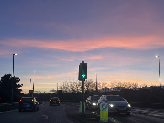 Cars travel a wet road at dusk. A traffic light glows green amidst the scene, with sparse trees silhouetted against the colorful sky. Streetlights line the roadway. The sky transitions from shades of pink and orange to blue and purple. Buildings appear faintly in the distance.