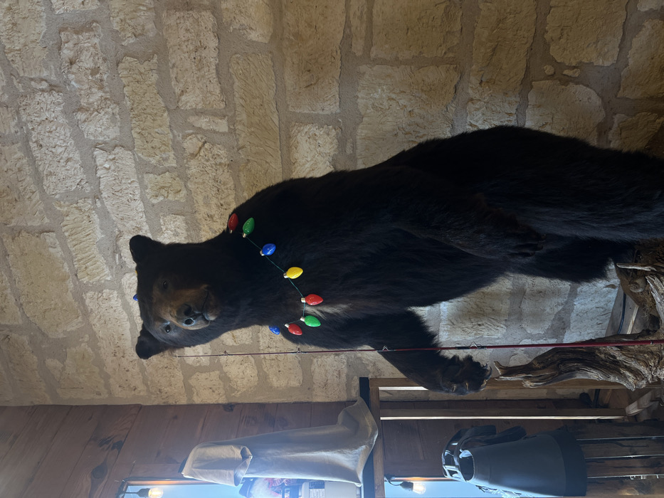 A taxidermied black bear is mounted against a roughly textured, light-colored stone wall. The bear is adorned with a string of colorful Christmas lights around its neck. Below the bear, there's a wooden structure, potentially part of the mounting. A light is barely visible through the lower corner.