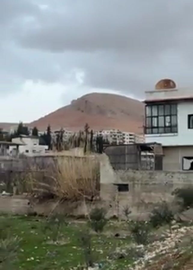 The camera pans from a view showing a hillside and town in the distance, to the side of a dirt road and an electric power pole. Overcast skies and a muted color palette define the atmosphere. The town features several buildings, with a large hill visible in the background. In the foreground, overgrown vegetation surrounds a partly ruined concrete structure. A modern white house stands to the right of the ruin. The dirt road runs alongside the scene. The overall mood is somber and unremarkable.