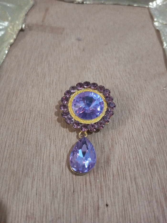 A single ornate piece of jewelry is positioned centrally on a light-colored wooden surface. The jewelry comprises a primary circular component featuring a large, faceted oval gemstone of a light purple hue, encircled by a border of smaller, faceted round purple gemstones. All stones are set in a gold-toned metal frame. A teardrop-shaped, faceted purple gemstone is suspended from the bottom of the circular component by a small gold-toned link. The underlying surface displays prominent light brown wood grain and discernible horizontal plank lines. A blurred, reflective, light-toned material is visible along the upper left edge of the frame. No individuals are present, and no actions are occurring. This scene is located in Chandragiri, Nepal.