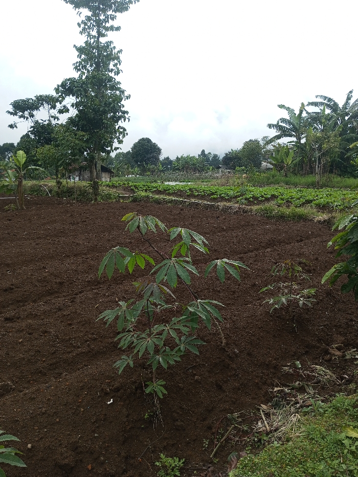The image depicts an agricultural field in Abbireddygudem, India, under an overcast sky. The foreground features dark brown, recently tilled soil. A small cassava plant with green palmate leaves stands prominently in the mid-right foreground. To the right of this plant, smaller green vegetation and debris are visible on the ground. In the midground, beyond the tilled soil, another section of cultivated land shows rows of smaller green plants. A body of water, possibly a pond or flooded area, is visible further back in the midground. The background is characterized by dense green foliage, including tall trees and banana plants on both the left and right sides. Small, simple structures, likely houses or outbuildings, are partially visible among the trees in the central background. No individuals or active processes are observed.