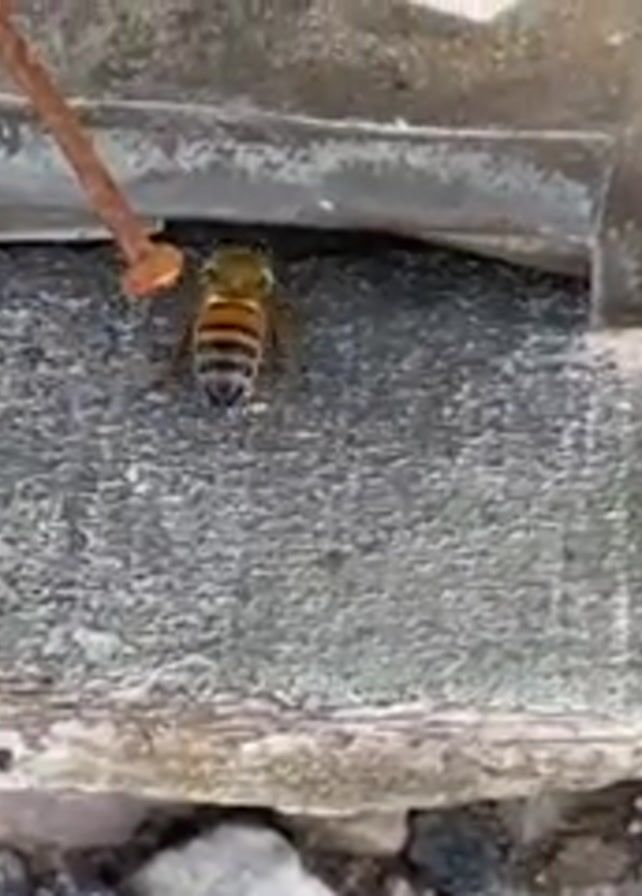 A close-up video shows a single bee carrying pollen as it moves along a gray, rough surface under some metal material