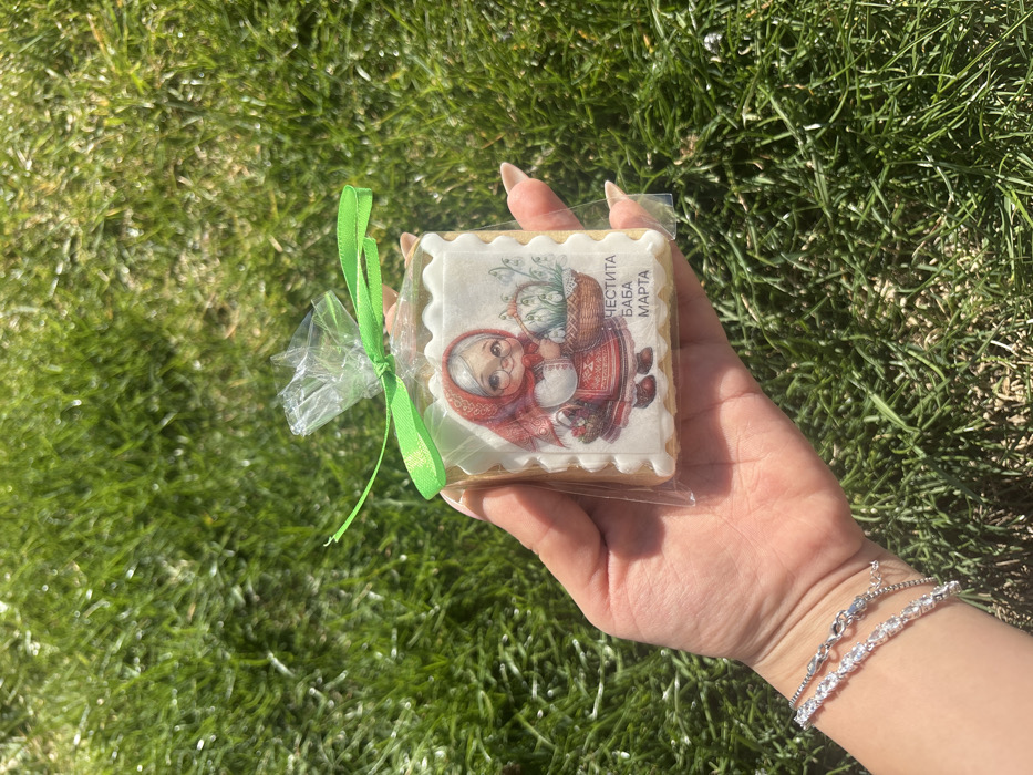A human hand holds a square-shaped, frosted cookie in clear plastic packaging, tied with a bright green ribbon, against a blurred background of green grass under direct sunlight. The hand, visible from the wrist to the fingertips, displays a light skin tone and manicured nails with a light pink polish. A silver-colored bracelet adorned with multiple clear, sparkling stones is worn on the wrist. The cookie is decorated with a white frosting border, featuring a scalloped edge on its upper side, framing an edible image. The image depicts a smiling elderly woman with gray hair, wearing glasses, a red headscarf with white patterns, and a traditional red and white embroidered dress. She holds two woven baskets: one in her left arm containing red berries and green leaves, and another larger basket in her right arm filled with white snowdrop flowers. Below the image, in black Cyrillic text, are the words "ЧЕСТИТА БАБА МАРТА" (Happy Baba Marta). The setting is outdoors in Dabene, Bulgaria, characterized by uniformly green grass filling the background, suggesting a lawn or field, brightly illuminated by natural light, casting subtle shadows on the hand.
