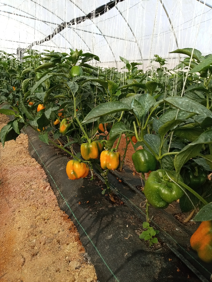 A greenhouse interior showcases rows of pepper plants bearing both green and yellow/orange peppers. The plants are supported by string. The ground is covered with a black material, with soil visible on either side. The greenhouse structure is visible above, with translucent panels allowing light to filter through. The overall impression is that of a successful and organized agricultural operation.