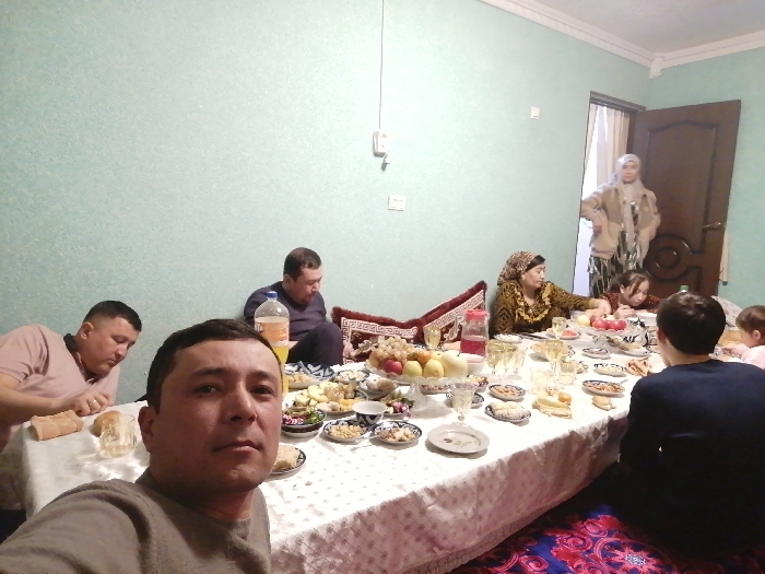 - "An indoor photograph captures eight individuals gathered around a long, white-tableclothed table heavily laden with food and beverages, indicative of a private residence in Samarkand, Uzbekistan" by FM-NK6PE2, licensed under CC BY 4.0