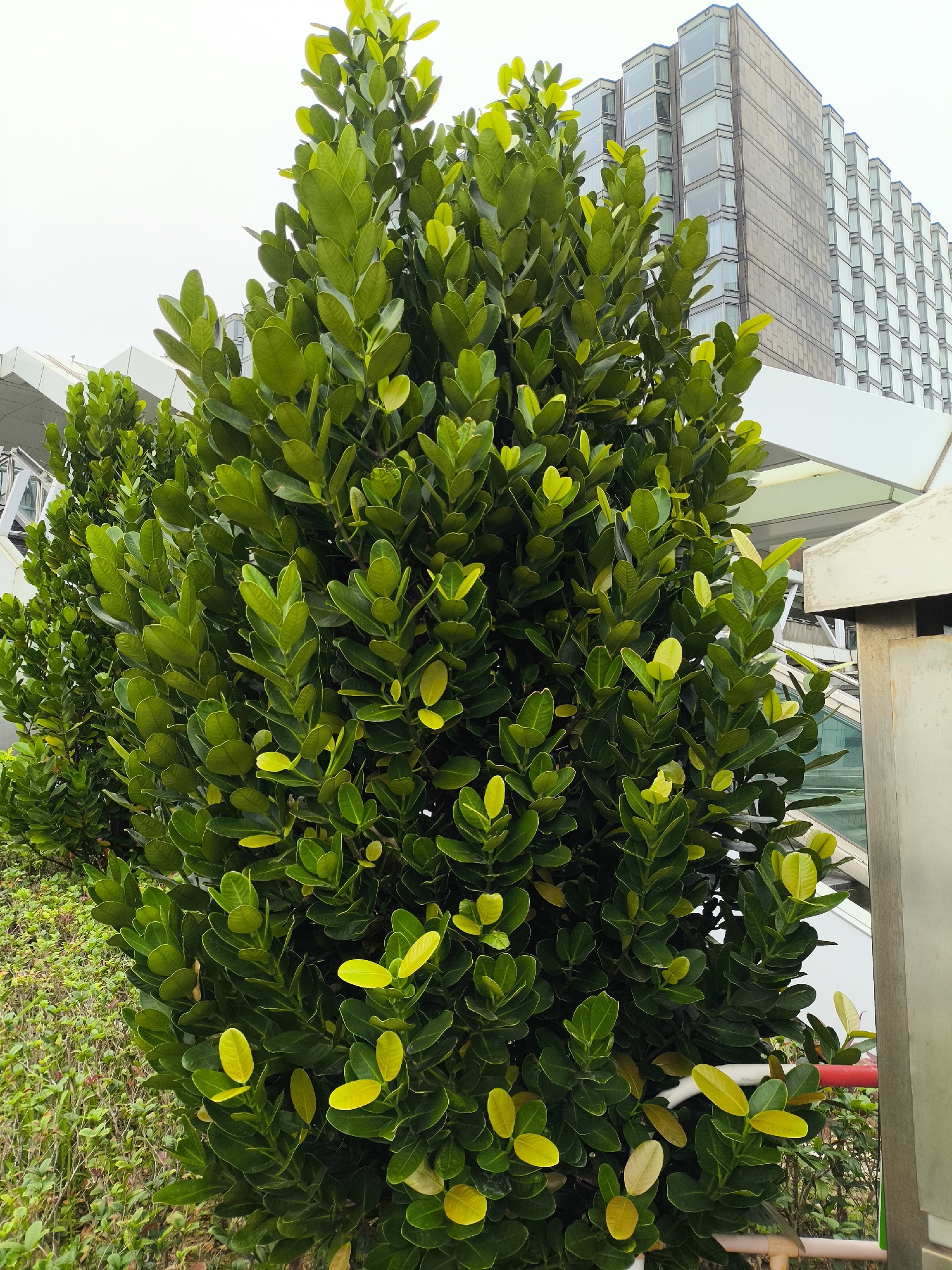The image depicts a dense shrub with glossy, rounded leaves of varying shades of green, some with yellow undertones, positioned in an urban setting. To the right, the corner of a modern building is visible with repetitive window patterns indicating a possibly commercial or residential structure. The sky is overcast. A white canopy structure is partially visible behind the shrub. A red and white pipe is visible at the bottom right. This scene is plausibly located in Hong Kong, China, based on the architectural style and vegetation.