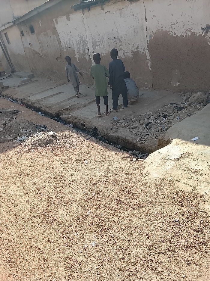 This image, captured in Gawuna, Nigeria, depicts four young males in an outdoor, urban setting. Three individuals stand in the mid-ground, facing away from the camera and towards a deteriorated building wall. The leftmost subject wears a light grey garment, the central subject wears an olive green garment and sandals, and the rightmost standing subject wears a dark blue or black garment. A fourth subject is crouched near the wall to the right of the standing individuals, also facing away, wearing a light grey garment. The background features a long, weathered building wall with sections of light-colored plaster over what appears to be a darker mud or earth base. The wall exhibits cracks and disrepair, with small, dark rectangular openings and a corrugated metal roofline visible along the top edge. In the mid-ground, a rough concrete or paved strip runs parallel to the wall, where the individuals are positioned. Immediately in front of this strip, a shallow, open drainage trench containing dark liquid and various debris, including rocks and refuse, spans horizontally across the scene. Piles of rocks, rubble, and discarded materials are visible alongside the trench and near the wall. The foreground consists of loose, reddish-brown earth or sand, showing distinct shadows cast from an unseen object to the right. The scene is under bright daylight.