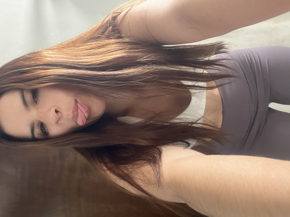 A young woman with long, light brown hair strikes a selfie pose. She is wearing a white top under a purple athletic shirt and matching leggings. Her head is tilted, and her tongue is playfully sticking out. The photo has a casual, intimate feel, as if taken spontaneously. The background is a neutral white wall, drawing focus to the subject.