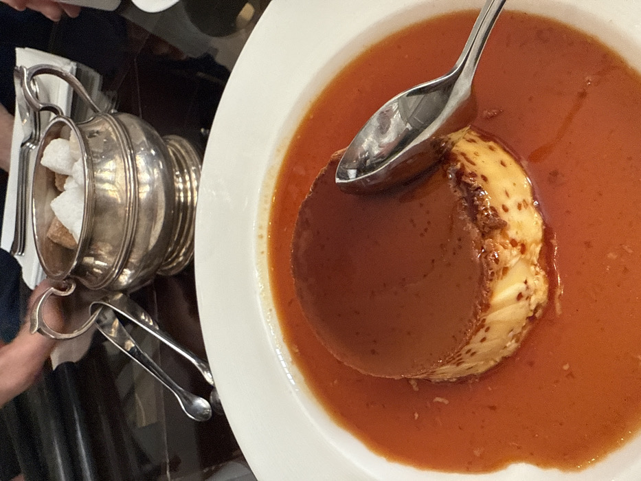 A close-up, elevated view captures a dessert served on a dark, reflective table surface. The central subject is a round flan or crème caramel, light yellow with a deep amber, glossy caramel topping, presented in a white, shallow ceramic bowl. A silver spoon rests on the flan, partially submerged in a pool of reddish-brown caramel sauce that fills the bottom of the bowl. In the background, to the left, a portion of a person's forearm and hand, dressed in dark attire, is visible. To the right of the background, a small, ornate silver sugar bowl with two handles contains white and light brown sugar cubes. A pair of silver sugar tongs hangs from the rim of this bowl. A white folded napkin and indistinct silverware are also partially visible behind the sugar bowl. The specific location within Tel Aviv, Israel, cannot be determined from the provided visual information.