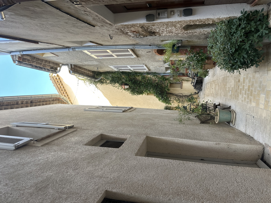 This image captures a narrow, brick-paved alleyway situated between two multi-story stucco buildings in Mougins, France, under bright daylight conditions