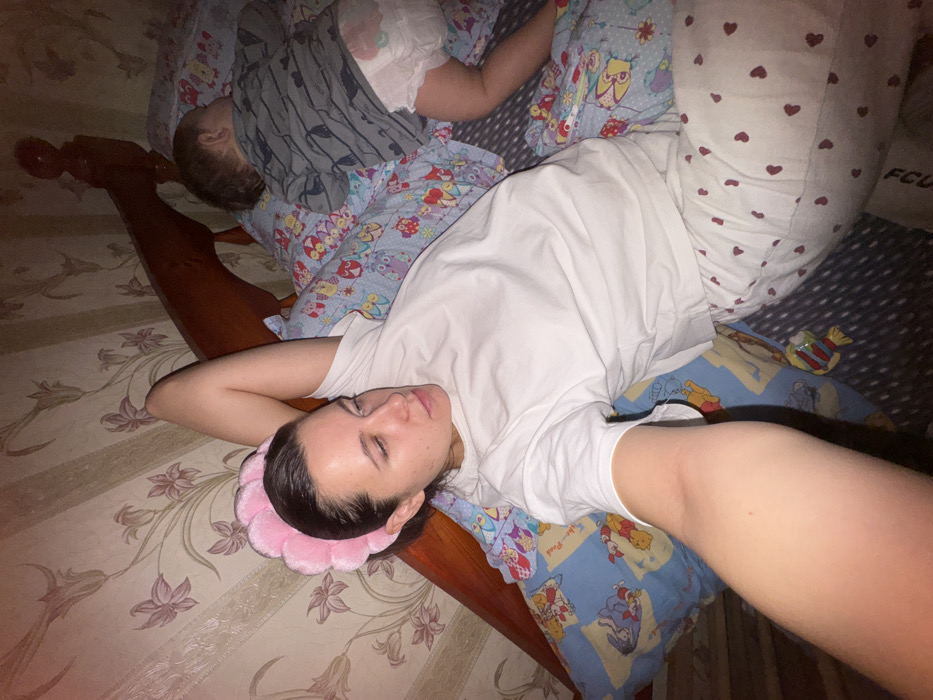 A woman wearing a pink headband lies on a bed with a patterned floral sheet, taking a selfie. She is wearing a white t-shirt. Adjacent to her, a baby in a diaper and a gray shirt is asleep on a blue patterned pillow. Another pillow with hearts is also visible. A piece of candy wrapper is near the woman.
