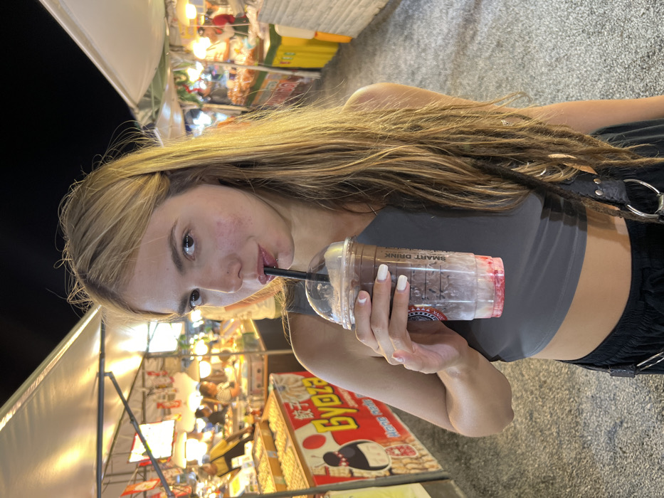 A young adult female stands centered in an outdoor night market in บ้านบางรักษ์, Thailand. She has long, light-brown hair, with some strands appearing matted or dreadlocked on her right side. She looks directly at the camera with a neutral expression. A stud piercing is visible on her left nostril, and a ring piercing is present below her lower lip. She is wearing a dark grey, one-shoulder crop top and dark lower garments. Her right hand, featuring white-tipped fingernails, holds a clear plastic cup containing a partially consumed layered beverage, dark brown over a red liquid, with "SMART DRINK" printed on the side. A black straw extends from the cup's dome lid to her lips, indicating active consumption. The background consists of brightly lit market stalls under white tarpaulin canopies. To the left, a stall displays trays of food items and a prominent red sign with a cartoon character and the word "Gyoza" in yellow script, along with Thai text and "HERE NOW." To the right, other stalls display various products. Indistinct figures are visible interacting with the stalls in the illuminated background. The ground is a dark, textured surface.