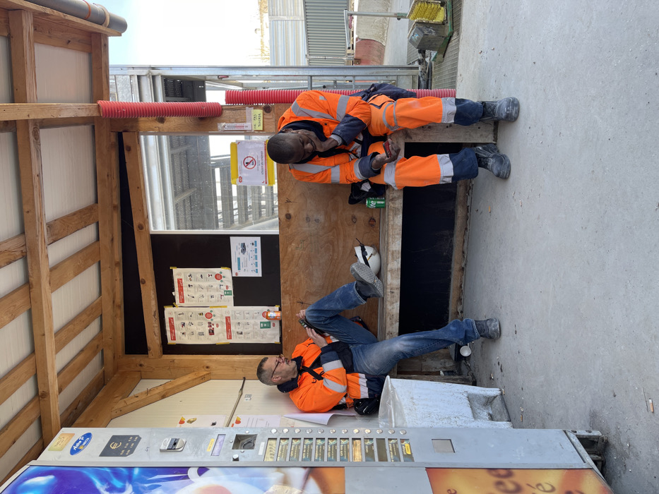 The image depicts two male individuals taking a break under a basic wooden shelter at an outdoor location, identified as a construction or industrial site in Antony, France