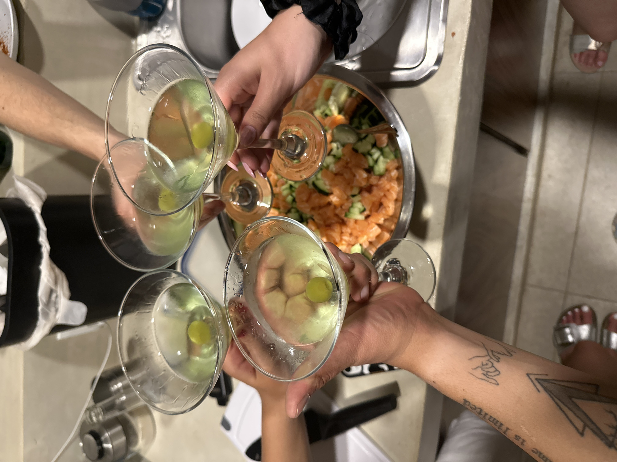 A group of people is toasting with drinks that have a greenish hue and olives in martini glasses. The toast is happening over a metal bowl filled with what appears to be a salmon and cucumber salad. One individual's arm is visible, showcasing tattoos, including an arrow and a pinky promise. A pair of silver sandals are visible in the background. The location is Brisas de Zicatela, Mexico.