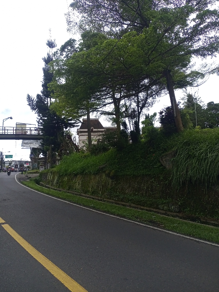 An asphalt road curves to the left with a yellow dividing line. Lush greenery and tall trees line the roadside, obscuring a building with a dark roof. A pedestrian bridge crosses the road in the distance. A concrete retaining wall supports the greenery. A motorcyclist rides along the road. The sky is overcast.