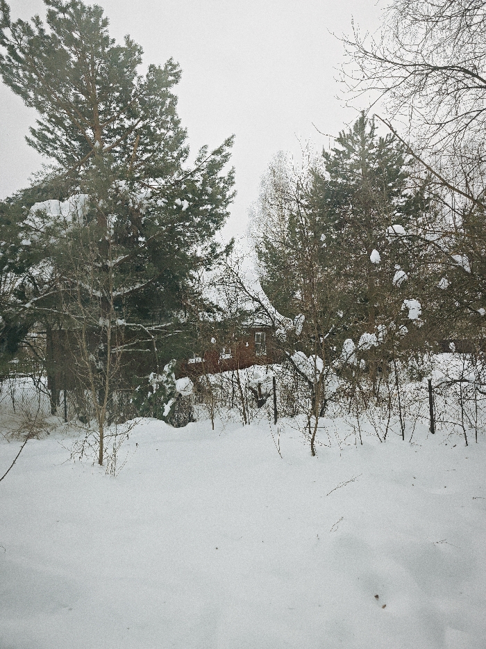 A wide-angle image captures a snow-covered winter landscape in Свистуха (кузяевский С/о), Russia, under an overcast, light gray sky. The foreground and midground are blanketed in deep, undisturbed white snow. A large pine tree, heavily laden with snow on its dark green needles, dominates the left side of the frame. Various deciduous trees and smaller pine trees, also bearing snow, are scattered throughout the scene, with the bare branches of deciduous trees visible against the sky and behind the conifers. In the middle distance, partially obscured by the trees and snowdrifts, a two-story residential building with reddish siding and at least two white-framed windows on its upper floor is visible. A rudimentary fence line, mostly obscured by snow and sparse vegetation, runs horizontally across the midground. No human figures or discernible animal tracks are present, indicating a static, uninhabited scene.