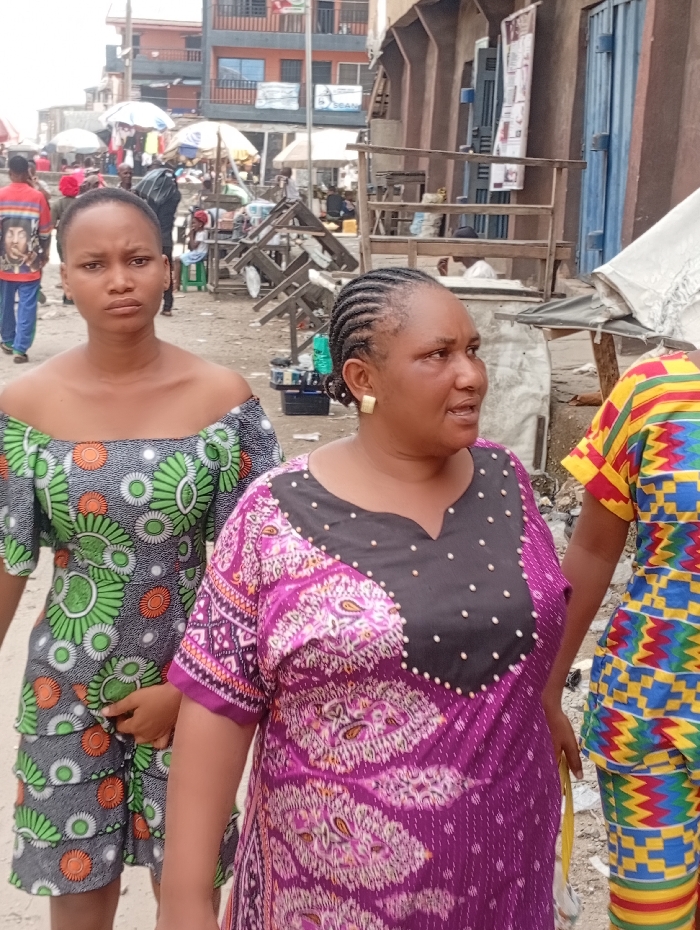 Three women stand in a cluttered outdoor space resembling a marketplace. The woman on the left wears a gray, green, and orange patterned off-the-shoulder dress. The woman in the middle wears a long purple dress with a black and white beaded neckline, with braids and gold square earrings. The woman on the right wears a brightly colored yellow, blue, and red patterned outfit. In the background are various stalls and people, with buildings visible in the distance. The atmosphere appears to be bustling and commonplace.