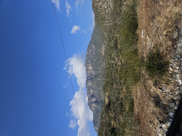 A mountain range rises sharply against a bright blue sky with scattered clouds. The mountain's terrain varies from rocky cliffs to green vegetation. Adjacent to the base of the mountain is a steep, arid slope with brown and tan foliage. A black line stretches across the sky, possibly an electrical wire. The overall scene captures the contrast between the sky, the rugged mountain, and the dry vegetation.