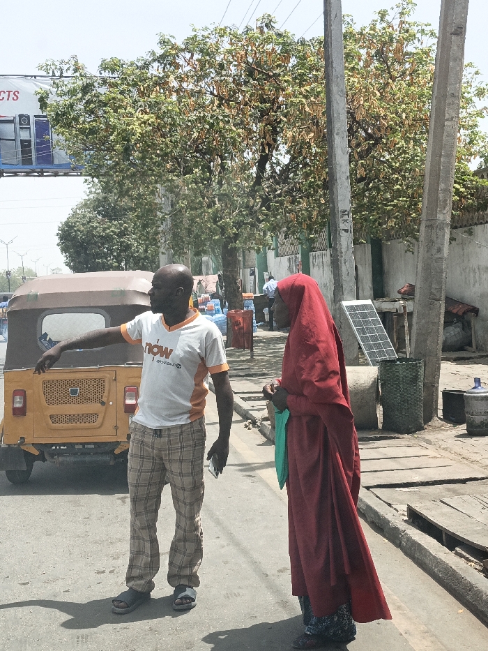 The image depicts a daytime scene on a paved street in Giginyu, Nigeria