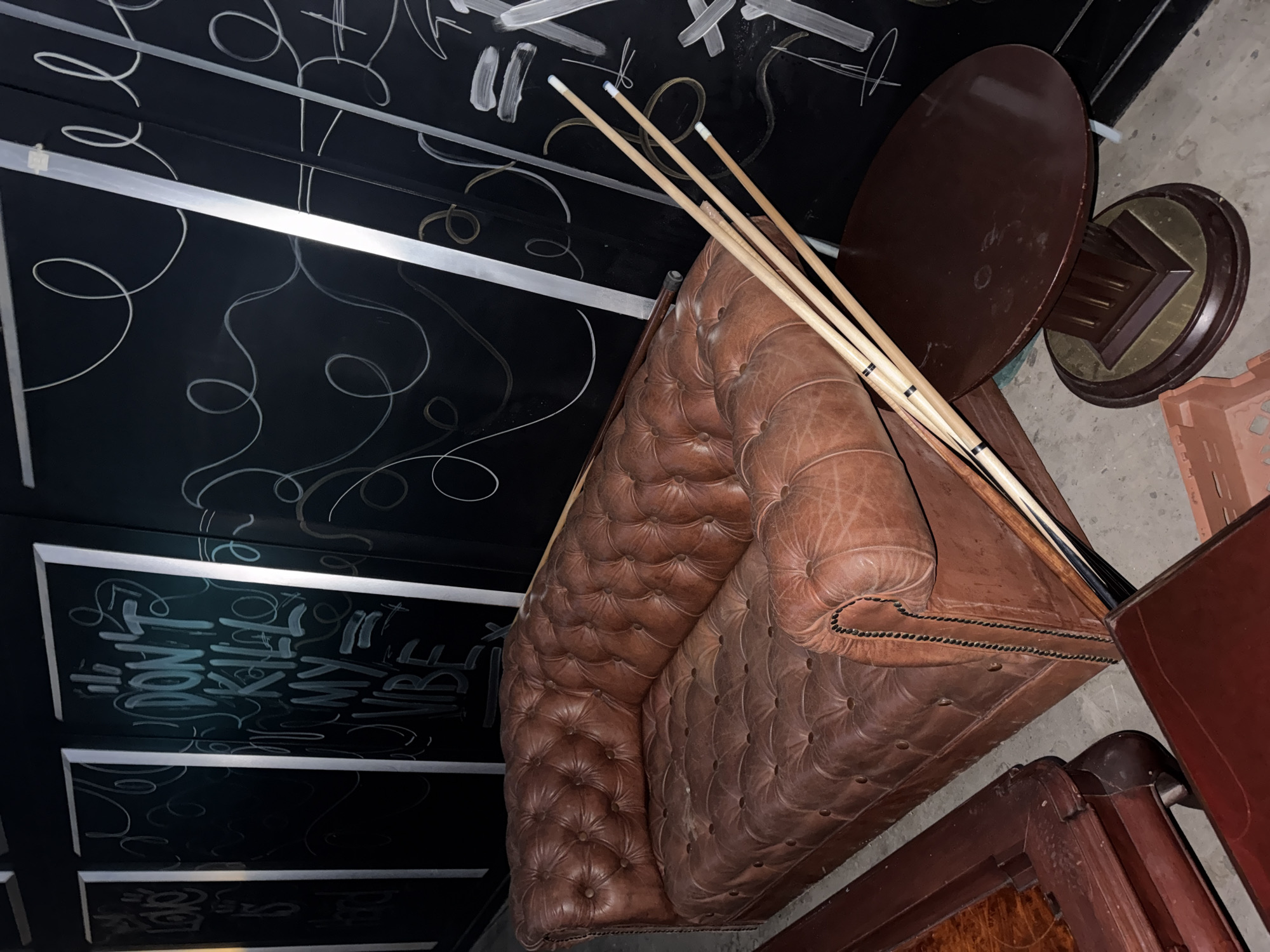 The scene is an interior space, consistent with a lounge or bar, located in an unspecified area of Mexico City, Mexico. The environment features dark, possibly blackboard-surfaced walls, decorated with white and light-colored chalk or paint graffiti-style art, including the prominent phrase "DON'T KILL MY VIBE" and abstract swirls. These wall panels are vertically segmented by metallic strips. The floor is a light grey, possibly concrete, surface showing some dust and scuff marks. In the foreground, a large, tufted, brown leather Chesterfield-style sofa occupies the central and left areas, displaying signs of wear and dust accumulation. Leaning against the dark wall to the right of the sofa are four wooden billiard cues. A round, dark brown wooden pedestal table, its surface scuffed, is positioned in the lower right. Partially visible in the lower left is a section of another dark wooden piece of furniture, possibly a large coffee table or part of a pool table, featuring intricate carved or inlaid details. A reddish-brown plastic crate is partially visible on the floor in the bottom left corner. No individuals are present in the depicted scene.