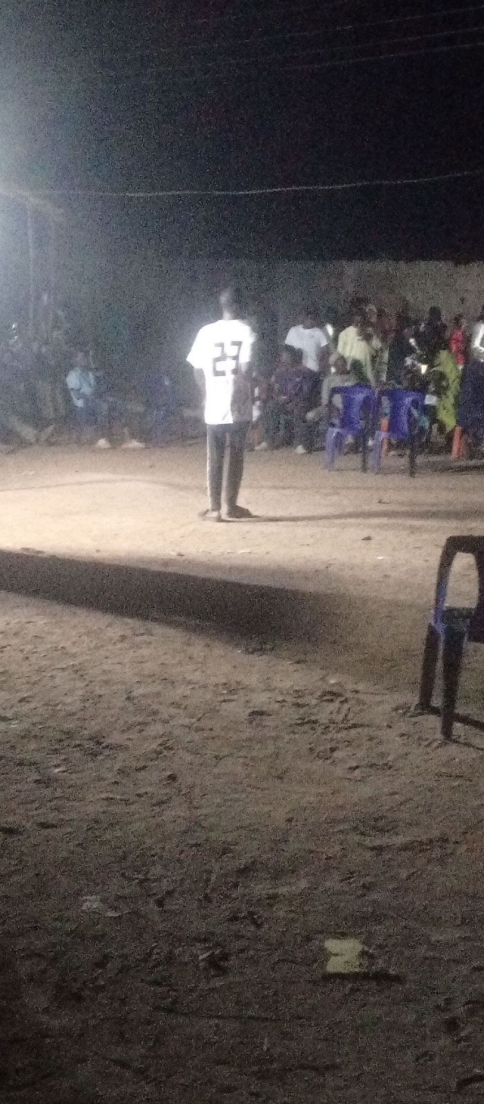 An outdoor gathering occurs at night under dim light. A man in a white shirt with the number 27 on the back stands facing away from the viewer. A crowd of people sits behind him in the background. Blue plastic chairs are visible among the seated individuals. The ground is a sandy or dirt surface, and a single chair stands alone in the foreground to the right. Electrical wires run overhead.