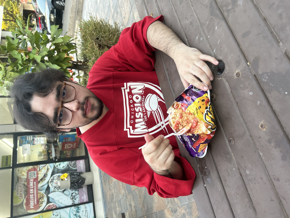 A person wearing glasses and a red hockey jersey is sitting at a brown wooden table. They are eating from a bag of chips with a white plastic spoon. The bag features colorful cartoon characters and appears to be slightly ripped open. The table has a hole in it, and the person is holding the bag close to the table. A storefront with posters is visible in the background, along with greenery and a parked car.