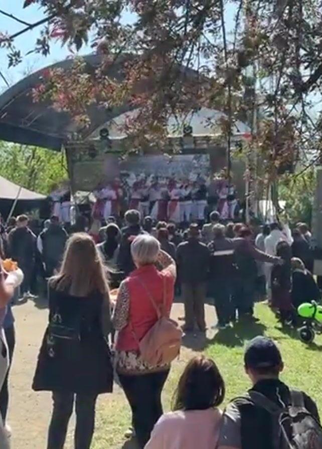 A crowd of people is gathered in a grassy area in front of a stage. A group of people in traditional Romanian clothing is performing a dance on the stage. The stage is covered with a black tarp, and there are speakers on either side. A tent is visible to the left of the stage. The scene appears to be a public event or festival taking place outdoors. The weather looks sunny. Some people in the crowd are holding food. Trees with green leaves are visible in the background, and a tree with pink flowers partially obstructs the view from the foreground.