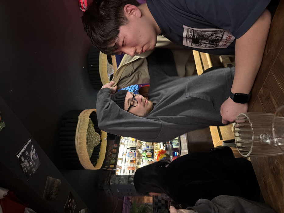 This image depicts an interior scene within a bar or pub in Rostov-on-Don, Russia, characterized by dim lighting. In the foreground, a wooden table holds a clear, vertically ribbed glass mug. Two male individuals are the primary subjects. On the right, a male of East Asian descent with short dark hair, wearing a dark blue t-shirt featuring a white graphic print (text and an architectural image, possibly "VINTYPES"), is seated. His right forearm, adorned with a black smartwatch, rests on the table. He is looking towards the left with a neutral expression. To his left, another male individual with light skin, wearing a black knit beanie, glasses, and a dark grey hooded sweatshirt, is depicted in the act of adjusting or removing a light brown jacket, which he holds overhead with both hands. His gaze is directed downwards and slightly to his right. In the mid-background, a dark-haired female, wearing a dark top, is seated with her back partially turned to the camera at a bar counter. Behind the counter, shelves display an assortment of illuminated liquor bottles. The ceiling, which is dark, features decorative elements including at least two large, fringed chandeliers with visible crystal components. A poster with "SYSTEM OF A DOWN" text is visible on the ceiling or upper wall.