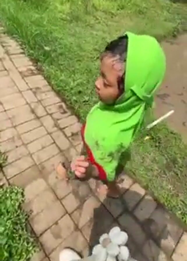 A child in a green head covering walks along a brick path in a grassy outdoor area. The child is barefoot and has mud on their clothing. The child looks up and briefly holds something in their hand before walking down the path. An adult reaches out a hand to the child as they walk. Other people are seen walking in the background. The environment includes grass, bushes, trees, and a muddy area. The weather appears sunny.