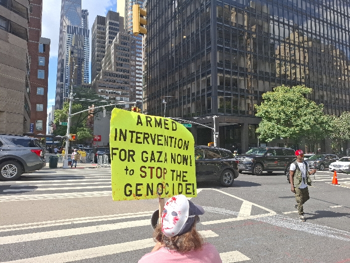 The image depicts a daytime street scene on 5th Avenue in Manhattan, New York City, United States, looking north from approximately 55th Street. In the foreground, the back of a person with curly brown hair, wearing a light-colored top, is visible. This individual holds a bright neon yellow sign with black capitalized text that reads: "ARMED INTERVENTION FOR GAZA NOW! to STOP THE GENOCIDE!" A white and grey baseball cap, featuring a red, white, and blue design and a white hockey-style mask attached to the back, rests on their head. They are positioned on a marked pedestrian crosswalk on an asphalt street. In the midground, to the right of the sign-holder, a male individual with dark skin, wearing a red baseball cap, white t-shirt, camouflage-patterned vest, and camouflage pants, walks across the street. He carries a dark backpack and holds a small, dark object, possibly a phone, in his right hand. Multiple vehicles, including dark SUVs and sedans, are present in traffic lanes. An orange traffic cone is visible on the far right. Overhead traffic lights and a yellow pedestrian signal are visible. Metal barricades are set up on sidewalks in the distance, where other pedestrians are also present. The background features the New York City skyline. On the immediate right, a large, multi-story building with dark glass windows and street-level trees is prominent, identifiable as The Peninsula Hotel at 700 5th Avenue. On the left, a tall, reddish-brown brick building is partially visible. Further back, numerous skyscrapers rise, including the distinctive 432 Park Avenue and other Midtown towers, under a blue sky with scattered white clouds. Sunlight casts shadows, indicating clear daytime conditions.