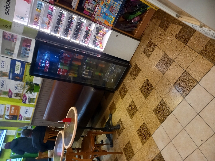 interior of a shop or café. A refrigerated display case holds drinks, positioned next to shelving filled with various goods. A brown banquette is accompanied by small, round tables and wooden chairs. Two people are seated at one of the tables. The floor is tiled in a square pattern with alternating brown and light tan tiles.